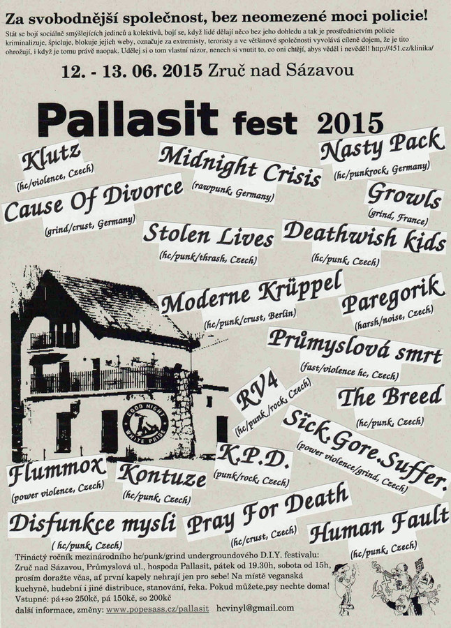Pallasit fest se letos uskuteční 12. a 13. června, jak jinak než v Pallasitu ve Zruči nad Sázavou Tento malý D.I.Y. undergroundový hc/punk/grind festiválek má za sebou už dvanáct ročníků a každý jeden byl jedinečný díky vám. Tak doufám že dorazí spousta dobrých lidí a zažijeme tu opět skvělou atmosféru! Určitě přijeď už v pátek! Kemp, řeka, parkování u akce, vege jídlo - kuchyně Vegano punx, stánek AFED, distra bez předchozích rezervací vítána, psy nechte prosím doma. Více informací a případné změny najdeš na: http://www.popesass.cz/pallasit Tentokrát pod trochu delším heslem, než naše obvyklé " Za čisté Posázaví bez nácků!", což samozřejmě platí také: Za svobodnější společnost, bez neomezené moci policie! Stát se bojí sociálně smýšlejících jedinců a kolektivů, bojí se, když lidé dělají něco bez jeho dohledu a tak je prostřednictvím policie kriminalizuje, špicluje, blokuje jejich weby, označuje za extremisty, teroristy a ve většinové společnosti vyvolává cíleně dojem, že je tito ohrožují, i když je tomu právě naopak. Udělej si o tom vlastní názor, nenech si vnutit to, co oni chtějí, abys věděl i nevěděl! 13.6.2015 Sobota 15:00 venku jedna hlučná bezejmenná parta z Ledče n S. Kontuze (hc/punk, Zruc nad Sazavou - Czech) http://bandzone.cz/kontuze RV4 (hc/punkrock, Benešovsko - Czech) http://bandzone.cz/rv4 Growls (grind, Nancy - France) - new band! http://growlsgrindcore.bandcamp.com/ Moderne Krüppel (hc/punk/crust, Berlin - Germany) - new band, (ex Autoritär, Ebola, M.V.D., ...) Cause Of Divorce (grind/crust, Aachen - Germany) http://causeofdivorce.bandcamp.com/ Midnight Crisis (rawpunk, Leipzig - Germany) https://midnightcrisis.bandcamp.com/ Nasty Pack (hc/punkrock, Leipzig - Germany) https://nastypack.bandcamp.com/ Klutz (hc/violence, Pardubice - Czech) https://klutzviolence.bandcamp.com/ http://kuklutz.noblogs.org/ http://www.soya-experience.blogspot.cz/ Paregorik (harsh noise, Pardubice - Czech) http://paregorik.bandcamp.com/ http://www.soya-experience.blogspot.cz/ Sïck.Gore. Suffer (power violence/grind, Liberec - Czech) http://sickgoresuffer.bandcamp.com/releases Flummox (power violence, Praha - Czech) http://flummox.noblogs.org/ Disfunkce mysli (hc/punk, Znojmo - Czech) http://bandzone.cz/disfunkcemysli K.P.D. (punkrock, Krhovice - Czech) http://bandzone.cz/kpd