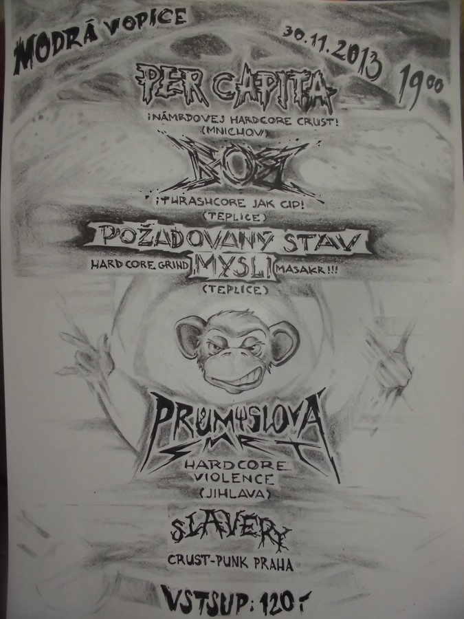 Zahrajou :PER CAPITA (Mnichov) , BOB(Jihlava) ,POŽADOVANÝ STAV MYSLI(Teplice) , PRŮMYSLOVÁ SMRT(Jihlava) , SLAVERY(Praha) . Klub MODRÁ VOPICE Praha 30.11.2013 vlez 120,-