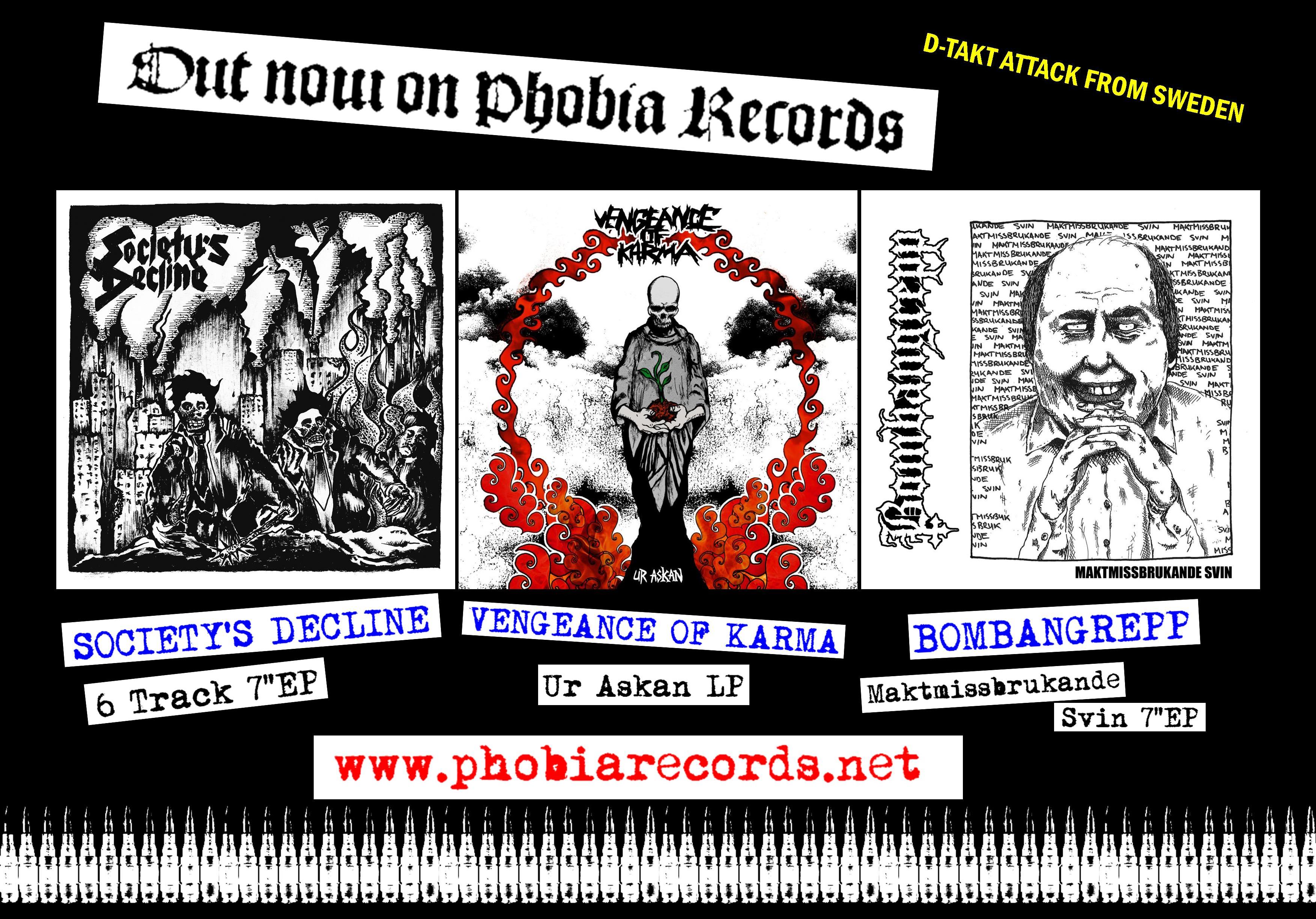 Tři nové tituly jsou venku u Phobia Records! PR 090 SOCIETY'S DECLINE - 6 Track EP - přísný a agresivní d-beat / punk přesně ve stylu Discharge / Anti-Cimex ze švédského Stockholmu. V sestavě členové Makabert Fynd nebo Dissekerad. Vylisováno 300 ks. PR 123 VENGEANCE OF KARMA - Ur Askan LP - debutní album švédké crust / d-beat kapely, ve které působí členové Myteri, Förgiftad nebo Gränslandet. Klasický skandinávský crust core s metal prvky ve stylu Martyrdöd nebo Wolfbrigade. 400 ks černý vinyl a 100 ks limitovaná edice na žluto-oranžovém splatteru. PR 126 BOMBANGREPP - Maktmissbrukande Svin EP - druhý singl švédské crust core brusky. Pokud máte rádi Krigshot / Totalitär je tohle to pravé! Hrubý, nasraný, špinavý a agresivní nátěr! Vylisováno 475 ks. Všechny tituly plus speciální sety na eshopu Phobia Records! Více na phobiarecords.net.