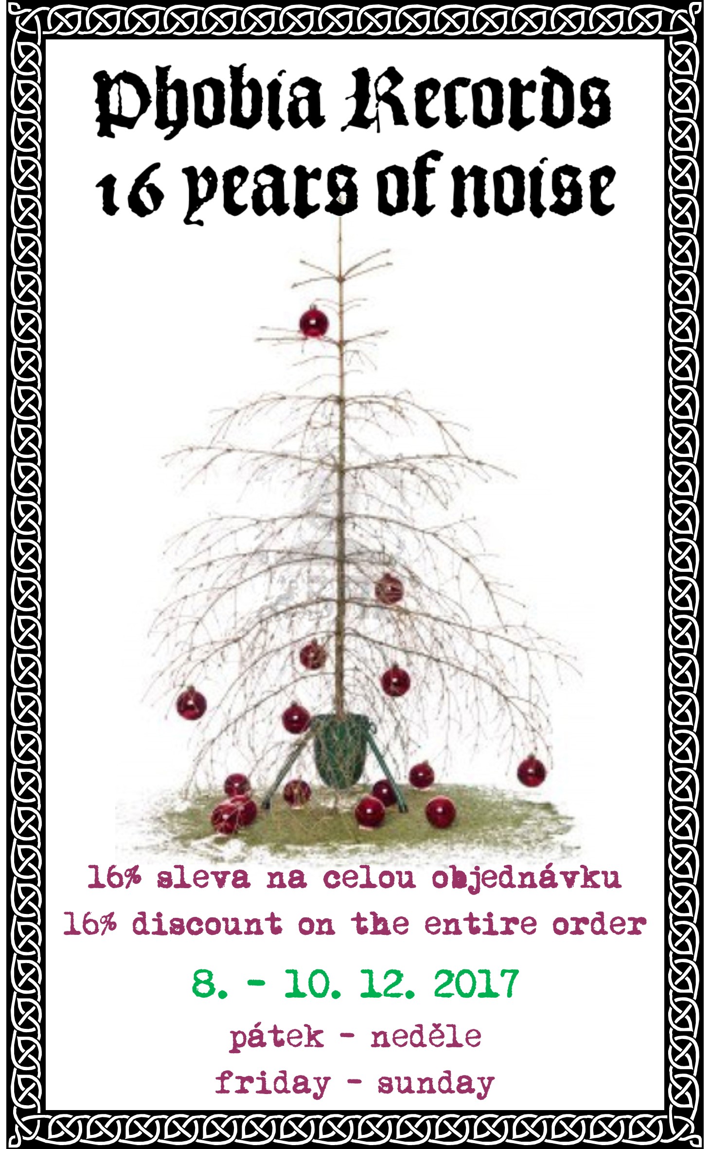 Tradiční prosincová akce labelu Phobia Records je tady. 16 let labelu znamenají 16% slevu na celou objednávku na eshopu. Od pátku do neděle.