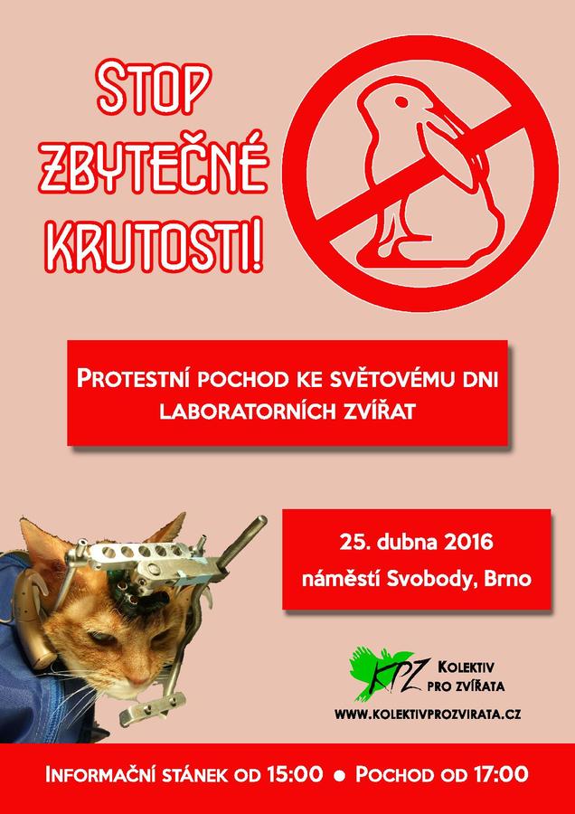V pondělí dne 25.4. v 17:00 se v rámci Světového dne laboratorních zvířat sejdeme na Náměstí Svobody a následně projdeme město. Tímto pochodem bychom chtěli poukázat na tisíce mrtvých a umučených zvířat, které jsou i nadále využívany jako pokusné objekty v laboratořích.