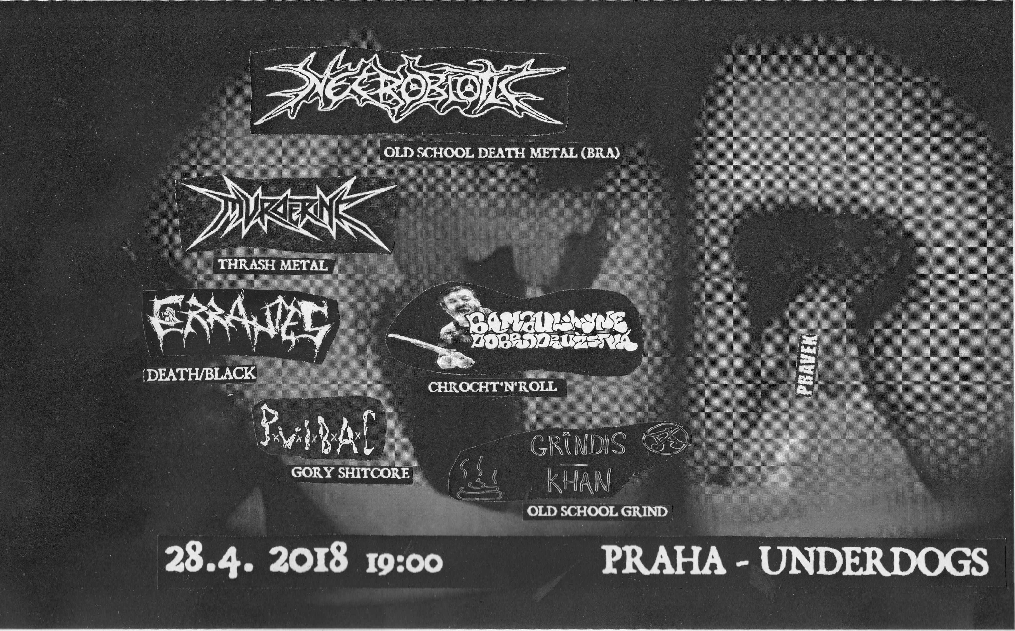 Pravěk Noise Section zve na Kruh krve: Necrobiotic (BRA) – old school death metal, aneb když se do klasiky vloží hoši z Brazílie, je o totální masakr postaráno! https://www.facebook.com/Necrobiotic/ Murder Inc. - thrash metal jak nažhavená břitva, máničky s nášivkama snad i na koulích, ovšem podobně syrovou a nadupaně energickou jízdu tady od jiný kapely v tomhle ranku prostě nezažiješ! Jo a s chystanym novym albem! http://bandzone.cz/murderinc Bambulkyne Dobrodružstvá – pohádkově vychrochtaný rock‘n‘roll s množstvím sypaček, občas i kopaček a většinou i o hlavy různorodými výměšky pleskaček! https://bambulkynedobrodrustva.bandcamp.com/album/the-wrath-of-grandpa-joseph Errantes - výrazně načernalý smrtící kov z Prahy http://bandzone.cz/errantes Penis Vacuated in Bloody Anal Creek – one man grind projekt ve stylu Putrid Pile, akorát syrovější, o 30 kilo míň deathu, ale o půl metru víc goru! http://bandzone.cz/pvibac Grindis Khan – nakopnutý grindcore poměrně důsledně se držící v mezích prvních dvou alb Napalm Death! http://bandzone.cz/grindiskhan + ještě jedna kapela, oznámíme brzy! vstupný – znáš to, doporučená férová klasika 150 a víc , dík! Keep on killing cool kids! http://praveknoisesection.blogspot.cz/