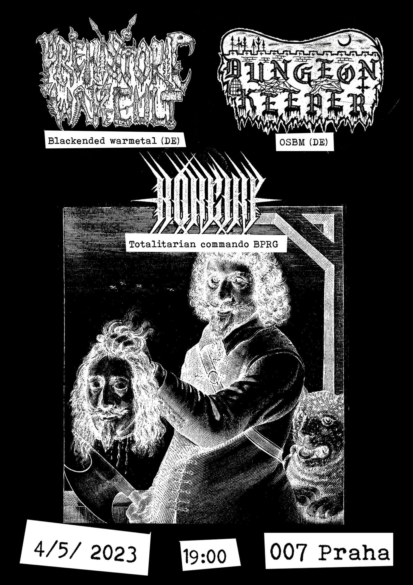 bestiální war metal kostilam PREHISTORIC WAR CULT, na původní klasiky žánru jako Isengard / Darkthrone / Carpathian Forest odkazující DUNGEON KEEPER a tuzemský black war metal virus KONČINY.