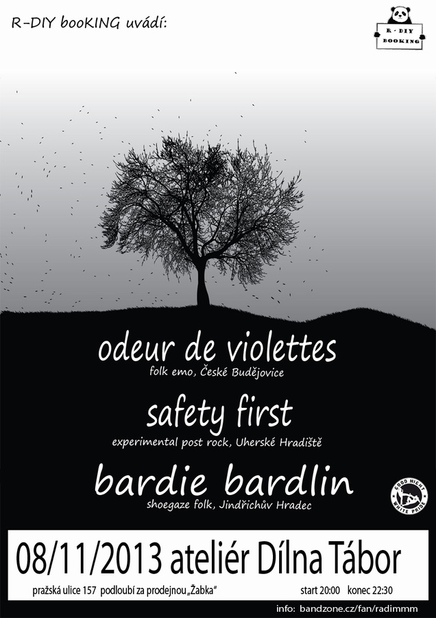 SAFETY FIRST (experimental post rock, Uherské Hradiště) +ODEUR DE VIOLETTES (emo folk, České Budějovice) + BARDIE BARDLIN (shoegaze folk, Jindřichův Hradec)