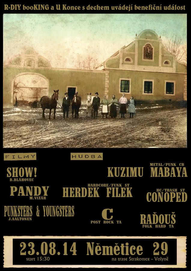 23.08.2014 (sobota) U Konce s dechem Němětice (u Strakonic) - CONOPED (hardcore/trash, Strakonice) + KUZIMU MABAYA (punk/metal, České Budějovice) + HERDEK FILEK(hardcore/funk, Strakonice) + C (post rock, Tábor) + RAĎOUŠ (folk hard, Tábor)