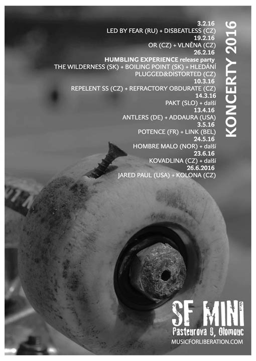 13.4.16 ANTLERS (DE) + ADDAURA (USA) 3.5.16 POTENCE (FR) + LINK (BEL) 24.5.16 HOMBRE MALO (NOR) 23.6.16 KOVADLINA (CZ) + další 26.6.2016 JARED PAUL (USA) + KOLONA