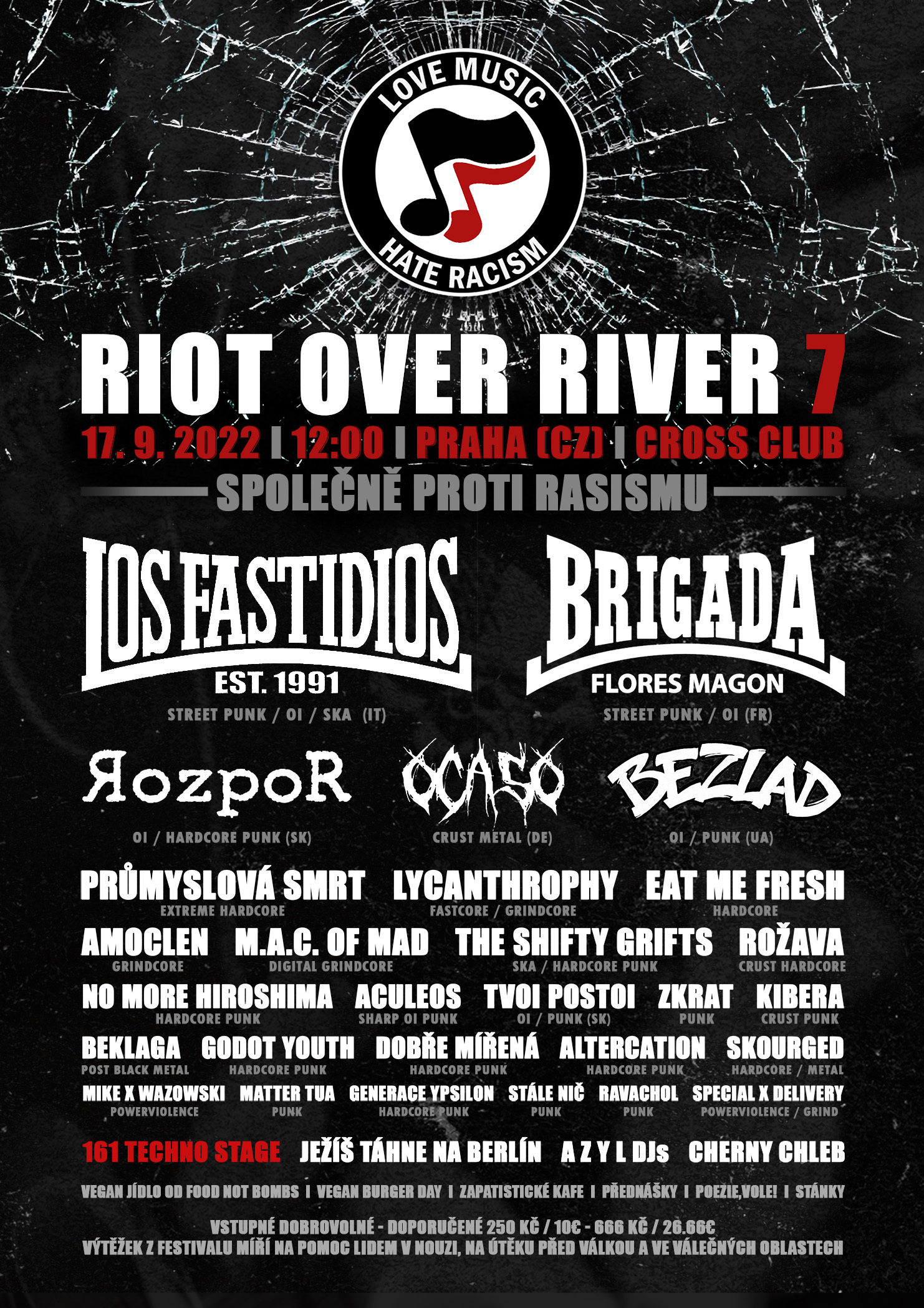 Punk, hardcore, rap, techno i undergroundový folk byly vždy spojeny s antirasistickými a antixenofobními postoji, vždy na straně utlačovaných. V roce 2022 tomu není jinak! Riot Over River je antifašistický a antirasistický festival, který říká jasnou zprávu: ,,Kultura, a ani žádná jiná oblast života není místem pro rasismus a diskriminaci!"