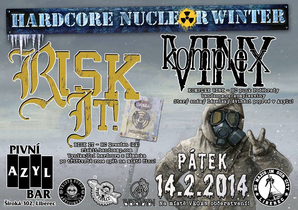 Pamatuješ na Riskt It v Azylu? Kvalitní hardcore s rozumnejma proslovama,super show.. 14. února jsou znova na místě činu, přijd zamoshovat :-) Komplex Viny- první koncert ostřílenejch lazeňskejch šviháků v libereckém pivním baru.. Raw punk na sto dvacet procent!