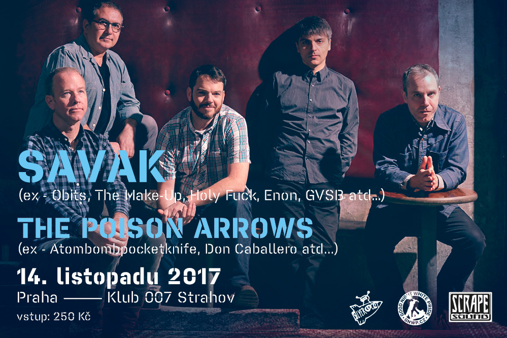 Varování hned na úvod: Savak nepředvádějí nic, co by tady už nebylo. Dělají to ale s takovou elegancí a s tak nakažlivou vášní (kde se to v těch chlápcích pořád bere?), že člověk snadno podlehne. A není to jen tím, kde všude hráli členové týhle kapely... Savak vznikli na troskách Obits (Sub Pop) a debutovou desku „Best Of Luck In Future Endeavors“ vypustili do světa před rokem, její následovník „Cut-Ups“ je jen pár tejdnů starej. A teď k tomu personálu: v sestavě najdete členy bez nadsázky legendárních kapel jako Nation Of Ulysses, The Make-Up, Enon, Holy Fuck atd... Za bicí usedne opět nezničitelnej Alexis Fleisig (Girls Against Boys, Soulside, Paramount Styles, Bellini). Těšte se na přímočarej rock s geniálníma melodiema a nakažlivým nadhledem chlapíků, kteří se touhle hudbou hlavně baví. Bavíme se s nima. Večer otevře další zajímavá formace The Poison Arrows – a i tady najdeme spoustu ex-zajímavostí: hlavně baskytaristu z Don Caballero a kytaristu a zpěváka Justina Sinkoviche z Atombombpocketknife (pamatujete vlastně ještě?). The Poison Arrows jsou z Chicaga a jejich zvuk si nespletete, pokud máte v malíčku katalog Touch And Go. Start ve 20.00, vstup 250 Kč. Obě kapely stojí za to.