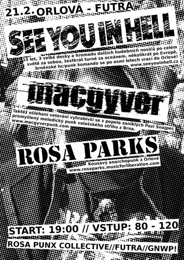 SEE YOU IN HELL - 15 let, 3 velké desky a hromadu dalších hudebních nosičů po celém světě za sebou, šestkrát turné za oceánem, několikrát po Evropě, brněnské hc/punk komando se po osmi letech vrací do Orlové! "To nejsvatější přikázání dneška, to světlo ve tmě, co tvé kroky vede: „Zneužij slabosti a chyb těch druhých, jak klíště vypusť jed, přisaj se na těle.“ Ta nejnižší podlost není dost nízká, ta nehorší lež není dost zlá. Když vzduchem nesou se otrávená slova. Když oběť věří, že ještě šanci má. Do všech stran úsměvy, přátelský škleb, však někde v koutě už vaří se jed" http://www.seeyouinhell.cz/ MACGYVER - Taktéž ošlehaní veteráni vyhrabivší se z popela zaniklých Pazi Snajper, promyšlený melodický punk valašského střihu z Brna. "Kdo hledá, většinou najde, jenže kdo hledá? Kdo nemá, většinou chce, jenže kdo nemá? Většina většinu chce...aspoň většinou. " http://www.macgyverpunk.com/ ROSA PARKS - Anarchopunx Orlová. "S pohledem upřeným na oblohu žíznivě vyhlížíme, kdy přijde déšť. Černé mraky padají na Hirošimu a my v dobytčácích zavření necháme se vézt. A pořád dokola!" http://rosaparks.musicforliberation.com/ Vstup: 80 - 120