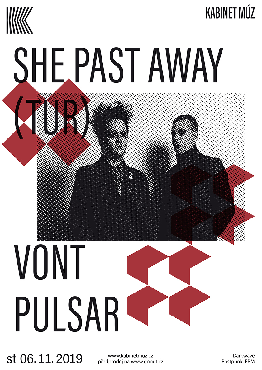 SHE PAST AWAY (TUR) Turecká dvojice SHE PAST AWAY se vrací do Brna, aby nás opět zavedla do svého temného a zároveň fascinujícího dark-wave prostředí časově zakotveným v osmdesátkovém soundu. Předpisový kytarový post-punkový zvuk a synth-dark-popový silně návykový chtíč, kombinovaný s minimalistickou poezií v Turečtině. Osobní zpověď plná sentimentální úzkosti a nihilistického myšlení. Letošní rok je pro SHE PAST AWAY ve znamení znovu vydání prvních dvou alb na americkém prestižním vydavatelství Metropolis (Front Line Assembly, Bauhaus, IAMX) a na konci května vypustili novou , v pořadí třetí, velkou desku s názvem "Disko Anksiyete". Tu představí také vedle svých osvědčených hitů na jediném plánovaném koncertu v ČR v Kabinetu Múz. https://shepastawayofficial.bandcamp.com https://shepastaway.org/ https://www.facebook.com/shepastaway/