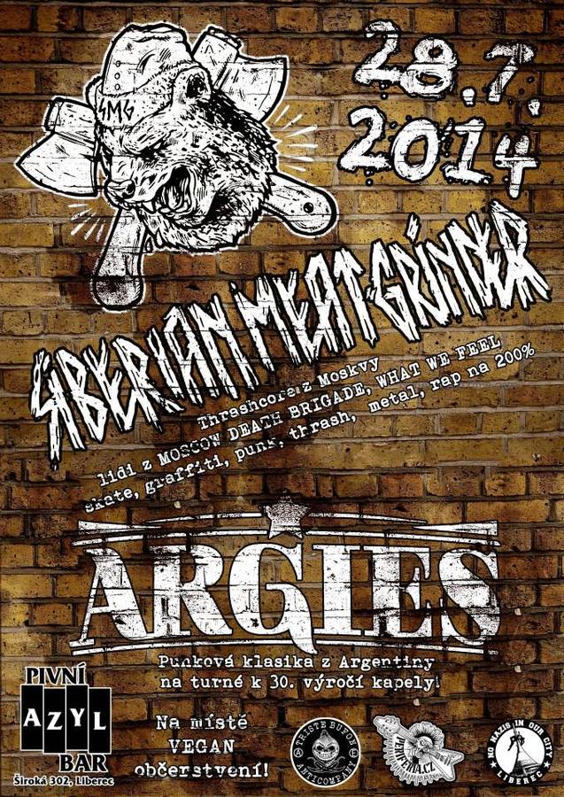 - ruská smečka starých mořských vlků, které můžete znát z jiných projektů jako Moscow Death Brigade, What We Feel nebo Villainz United, chrlí od roku 2012 temný mix rapu, metalu a hardcore-punku. Jejich zvuku se dostalo hodně vlivu z působení v jiných kapelách i z hudby, kterou sami léta poslouchají. Surové metalové texty nesou taky určitý politicko - sociální přesah, no v první řadě se banda snaží tentokrát prosadit na širší mezinárodní scéně. Svoje si v jejich písních najdou určitě i návštěvníci skate parků nebo fanoušci streetartu. Zejména pak malování graffiti patří k oblíbené činnosti projektů jako Badline Syndicate nebo Morda Crew, kolem kterých se kapela formovala. http://siberianmeatgrinder.bandcamp.com/ ARGIES