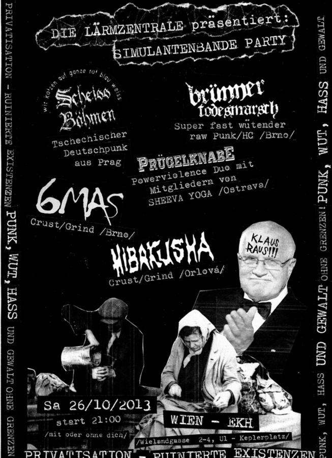 Kdo: SCHEISS BÖHMEN (Praha) / PRÜGELKNABE (Ostrava) / BRÜNNER TODESMARSCH (Brno) / 6 MAS (Brno) / HIBAKUSHA (Orlová)