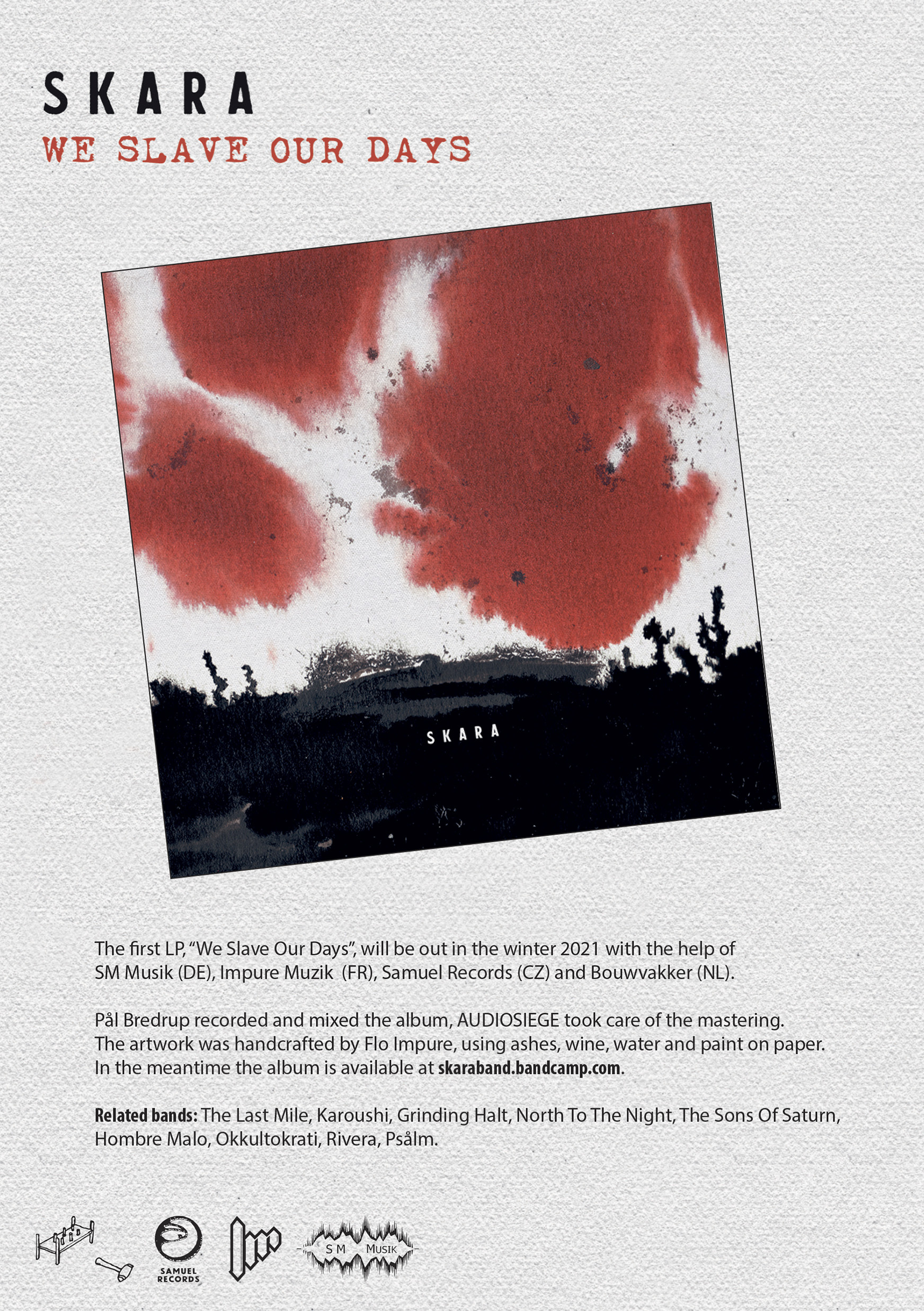 SKARA je poměrně nová kapela z norského Osla, která se zrodila v roce 2019. Najdeš v ní členy The Last Mile, Karoushi, Grinding Halt, North To The Night, The Sons Of Saturn, Hombre Malo, Okkultokrati, Rivera, Psålm. Všichni členové SKARA mají rádi DIY hardcore punk a je to cítit i z jejich muziky, mixu intenzivního hardcore s množstvím ingrediencí. Jejich debut se jmenuje “We Slave Our Days” a vychází v prosinci 2021 na 12"LP vinylu, za spolupráce SM Musik (DE), Impure Muzik (FR), Samuel Records (CZ) a Bouwvakker (NL). Album nahrával Pål Bredrup (Haust, Okkultokrati), o mastering se postaral Brad Boatright (AUDIOSIEGE) a obal dělal Flo Impure. Nahrávka je k poslechu na samuelrecords.bc.com.