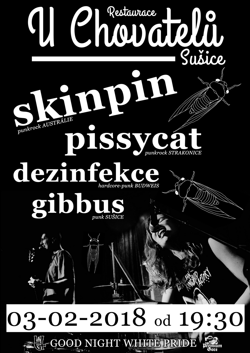 SKINPIN (Sydney) + PISSYCAT (Strakonice) + DEZINFEKCE (ČB) + GIBBUS