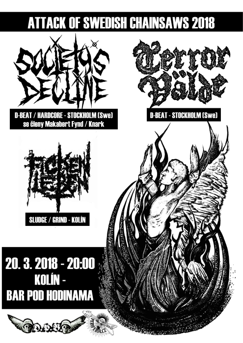 SOCIETY’S DECLINE (Stockholm, Švédsko) Jeden z nejlepších klonů Discharge z poslední doby. Samozřejmě s velkou porcí typického švédského hardcoru alá Anti-Cimex nebo Mob 47. Tahle smečka má na kontě zatím pouze samostatný sedmipalec, ale koncertně jsou tihle agilní švédové hodně aktivní. Navíc jim ke konci jara konečně vyjde první album, které je masakr! V sestavě Anders, kterého můžete najít v x dalších kapelách jako jsou Makabert Fynd, Terrorvälde, Knark atd. atd. https://societysdecline.bandcamp.com/ TERRORVÄLDE (Stockholm, Švédsko) Další švédská d-beat / punk bruska ze stejného města (i těsta) jako Society’s Decline, pouze s menším rozdílem a to, že texty mají v portugalštině. Takže klasická käng záležitost načichlá brazilskou hardcore školou alá Ratos De Porao atd. Se členy Idiot Ikon v sestavě. https://terrorvalde.bandcamp.com/releases