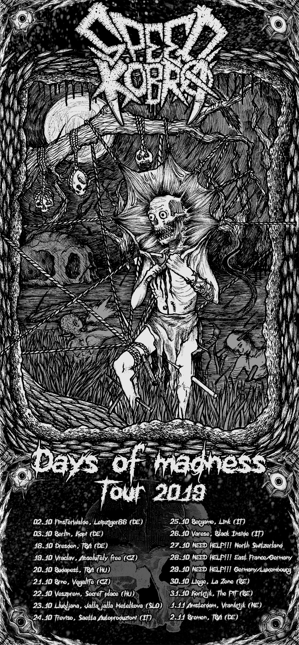 Metal punx z Berlína SPEEDKÖBRA mají venku velkou desku s názvem "Days Of Madness" která vyšla v sedmi různých, barevných edicích za mezinárodní spolupráce labelů. Vinyl bude k dostání na jejich turné, respektive na dvou českých koncertech ve Vraclavi a v Brně. Poslech všech deseti rozstřelů je možný na bandcampu kapely. Čekuj leták s daty koncertů.