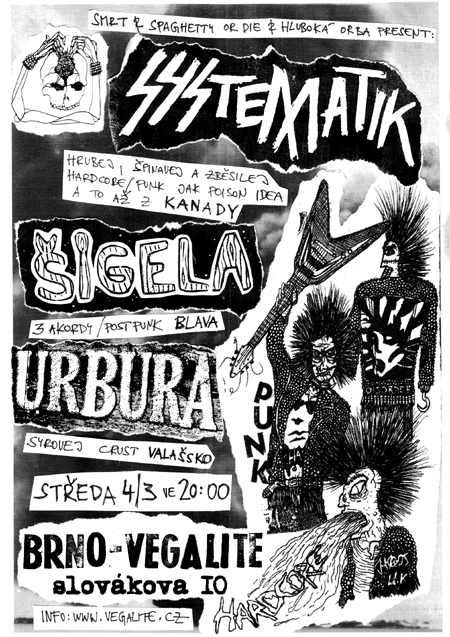 Smrt, Spaghetty Or Die a Hluboká Orba present: SYSTEMATIK (Vancouver, Kanada) - hrubej, špinavej a zběsilej hardcore/punk připomínající POISON IDEA a další klasiky US hardcore z 80. let se solidním d-beat rytmem (kytarista hrával v ortodoxní d-beat smečce UNLEARN) poprvé na turné po Evropě. Debut LP na profláklém kanadském labelu Deranged Records, aktuální LP k turné vyjde na Sabotage Records. Ukázky z nového LP tady: https://sabotagerecords.bandcamp.com/album/systematik-bondage-lp Debut LP tady: https://derangedrecords.bandcamp.com/album/systematik Demo z r. 2011 ke stažení tady: http://terminalescape.blogspot.cz/2012/05/systematik.html ŠIGELA (Bratislava) - postpunková melancholie, syrová tříakordová jednoduchost, basové linky připomínající ruskou legendu GRAŽDANSKAJA OBORONA, ex-S.I.K.A./STEH! Demo tady: http://bandzone.cz/sigela http://sigela.bandcamp.com/ URBURA (Valašsko) - zbrusu nová kapela poskládáná z ostřílených hráčů rozpadlých valašských smeček jako byli HOMO CONSUMENS (bicí mašina Sirák!), DEPRESY MOUSE nebo SAME OR DIFFERENT, syrová crust punková jízda v typicky autentickém místním podání… http://bandzone.cz/urbura Koncert začne přesně a skončí do 22:30, bude ho zvučit Tom Yacht, bude nekuřácký a stát bude lidových 130 Kč. Info: www.vegalite.cz