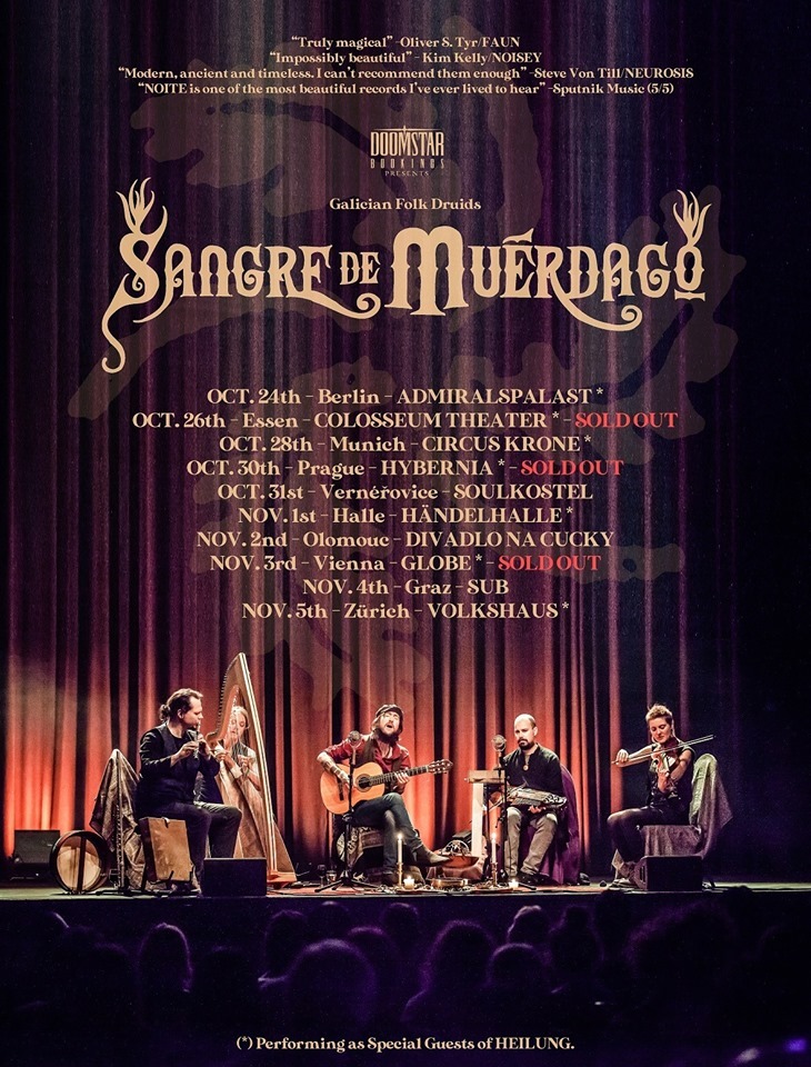 Dnes začíná kratší evropské turné Sangre de Muerdago. Původně se jednalo o jednočlenný projekt Pabla Ursussona, který vyrostl v "regulérní" kapelu. Mají za sebou několik turné po celém světě a jejich hudba je inspirovaná tradiční hudbou Galicie, anarchismem, láskou i zlobou. Zasněné kytary, doplňují další středověké nástroje a společně vytváří souhry, které extrémně tlačí na emoce. Před sebou mají 11 koncertů, ze kterých je 7 vyprodaných. V ČR zahrají v Praze, Vernéřovicích a Olomouci. Po tomto turné by měli nahrávat další desku. K poslechu na sangredemuerdago.bc.com.