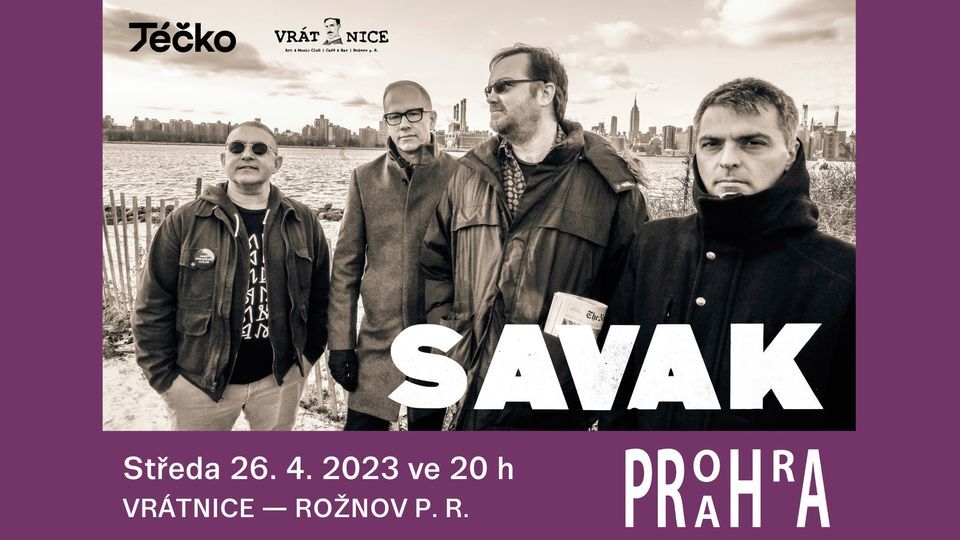 Stárnout s muzikou není úplně snadná věc – existují ale muzikanti, kteří naopak s přibývajícími roky vysílají zpátky do světa o to radostnější energii. Členové Savak jsou dokonalým příkladem. Jejich sestava je ostatně sama o sobě procházkou historií významné části nezávislé scény – v kapele najdete kromě Sohraba Habibiona z Obits a Michaela Jaworskiho z The Cops i členy bez nadsázky legendárních kapel jako Nation Of Ulysses, The Make-Up (příležitostný koncertní baskytarista James Canty, který hrál i s Tedem Leem) a Enon nebo Holy Fuck (bubeník Matt Schulz). Savak vznikli na troskách Obits (Sub Pop) a debutovou desku „Best Of Luck In Future Endeavors“ vypustili do světa v roce 2016: aktuální páté album „Human Error / Human Delight“ vyšlo loni. K čemu tuhle kapelu přirovnat? „It’s electric guitar-oriented music, falling somewhere between the four corners of 60s garage rock, 70s punk, 80s American underground and random other things like free jazz, musique concrète, Zamrock and Chicha. If you’re into The 13th Floor Elevators, The Adverts, The Dream Syndicate and Chrissy Zebby Tembo, you might dig what we do,“ popisuje Sohrab. Kdo sakra ví, co je Chrissy Zebby Tembo? Asi nikdo, ale Sohrab má jinak vždycky pravdu. Savak na letošním evropském turné doprovodí na několika koncertech tuzemská Prohra Praha (ex – Gnu, Planety, Laundered Syrup), protože obě kapely se rozhodly vydat své nové songy na společném kazetovém splitu. www.savakband.com/ https://www.silver-rocket.org/kapely/prohra-praha Vstupné v předprodeji: 200 Kč, v den akce a na místě: 250 Kč. Předprodej od 14. 3. 2022 v sídle Téčka, TIC nebo online.