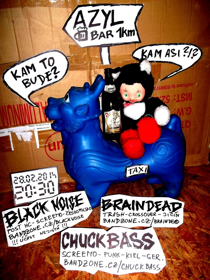 Black Noise dnes potvrdili účast, tak všichni rámus milující alkoholici pošetřete ušní bubínky, taneční střevíce a ledviny na 28.2. 2014. Premiéru si v Azylu odbydou i emočně nevybitý chlapci ze severního Německa Chuck Bass, a trashový drtiči Braindead - CZ. Řvoun s basákem jsou vášnivý bmx jezdci. Když se seženou nějaký překážky, bude možná i "sportovní vložka".