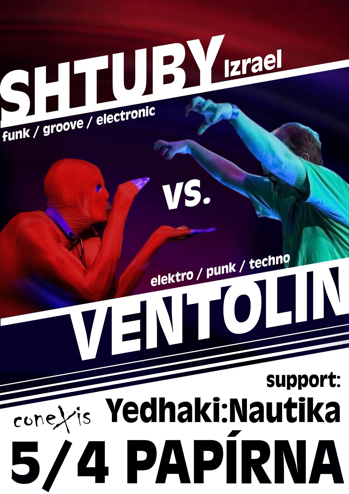 SHTUBY / Izrael funk / groove / electronic https://www.facebook.com/shtuby/ https://shtubylive.bandcamp.com/ https://www.youtube.com/watch?v=E_FRd40b4g8 VENTOLIN elektro / punk / techno https://ventolin1.bandcamp.com/ https://soundcloud.com/ventolin https://www.youtube.com/watch?v=ZdZZ0cgawJg YEDHAKI:NAUTIKA ethno / experimental / world music https://soundcloud.com/yedhaki-nautika https://www.facebook.com/YedhakiNautika?fref=ts https://www.youtube.com/watch?v=tu53I9msNL0&list=UUBJ0OmaMlegcI5VfPne6jJA