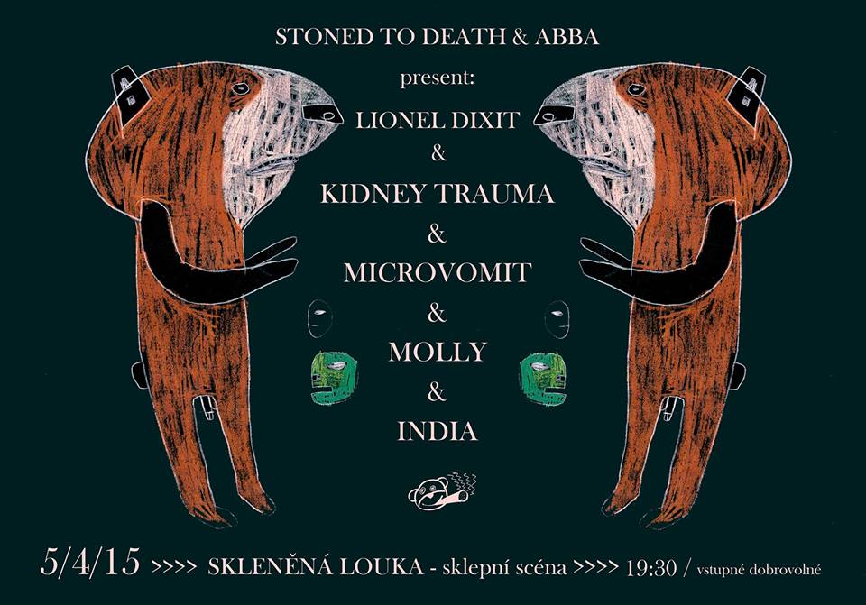 KIDNEY TRAUMA Budoucími parťáky ze splitu s India jsou Kidney Trauma. V sestavě KT najdete Dojče (Microvomit), Bejbiše a Markétku. Stalo se, že v létě 2014 odjel Dojč coby řidič na turné se svojí oblíbenou kapelou Les Rhinocéros. Dva dny na to skončil v hamburské nemocnici pod dohledem doktorů, kteří se ultrazvukem pokoušeli rozbít Dojčovy ledvinové kameny, které tou dobu narostly do rozměrů pecky z výjimečně velkého avokáda. Dojč tak turné nikdy nedokončil, ale domů se vrátil se jménem pro novou kapelu. Debutní track ze splitu s India si můžete pustit níže. Říct stačí jen dvě věci: Kidney Trauma jsou neuvěřitelně uhrančivá kapela a mají úplně brutální basu! https://soundcloud.com/stoned-to-death-records/kidney-trauma-doplnit