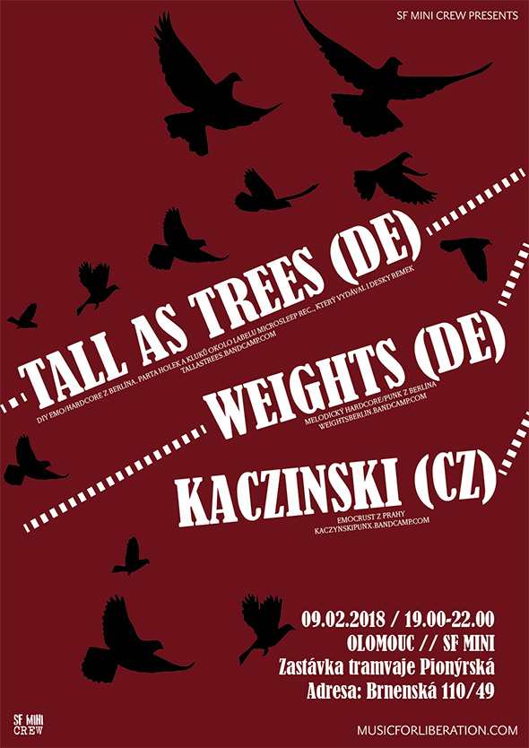 TALL AS TREES - diy emo/hardcore z Berlína. Parta holek a kluků okolo labelu microsleep rec., který vydával i desky Remek. https://tallastrees.bandcamp.com/ WEIGHTS - melodický hardcore/punk z Berlína https://weightsberlin.bandcamp.com/ KACZYNSKI - emocrust z Prahy. Důkazem zalíbenosti v žánru může být fakt, že kytarista hrál ve Signa Sinistra (Slovenský emocrust z dob, kdy ještě hrály kapely jako Ekkaia) https://kaczynskipunx.bandcamp.com/