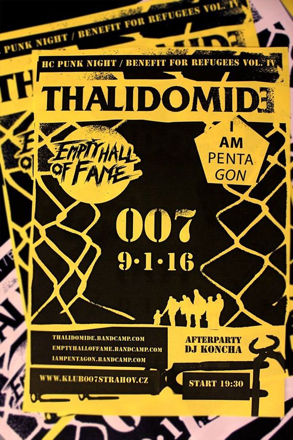 Přestože Thalidomide oznámili poslední koncert v současné sestavě už před časem v Bubnu, rozhodli se nakonec přeci jen ještě jednou sejít a podpořit akci, která je v této době více než potřebná. Navíc, nyní už není tajemstvím, že k dalším nepokojům je připraven nový line up, takže hra pokračuje! Druhou kapelou budou příznačně Empty Hall of Fame, protože právě s nimi se na přelomu roku chystají Thalidomide vydat split lp a když půjde vše podle plánu (což pravda jde málokdy), získá tato positive párty další rozměr a smysl. Jinak Empty Hall of Fame hrají parádní energický hard core se silným poselstvím, nedávno se vrátili z úspěšného turné po Brazílii a jsou v životní formě! Jako třetí zahrají Iam Pentagon, staré tváře v novém projektu. Členové Balaclava, Kevorkian nebo Airbags se v mnohém zasekli v 90. letech a kapela nazvaná podle songu od Make-Up to jen podtrhuje. Celý večer uzavře vypečená poštěčka a kouřit se bude venku. See you in da pit!