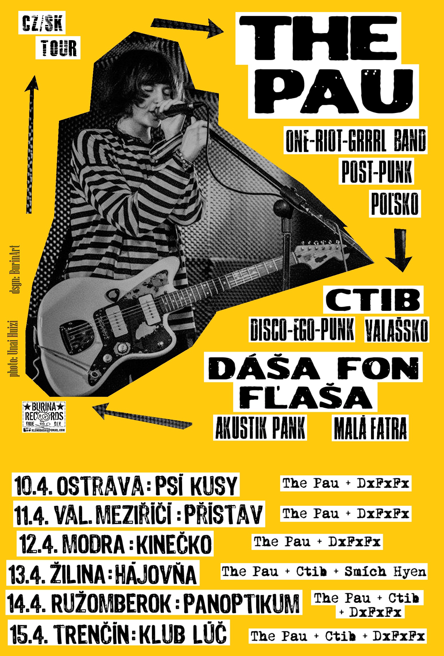THE PAU https://thepau1.bandcamp.com/ https://www.facebook.com/thepauMusic/ jednočlenná riot grrrl band z Poľska, Paulína cestuje iba sama s gitarou a mobilom, odkiaľ si púšťa podmazy pri živom hraní. hudobne je tam cítiť starý poľský cold-wave, energia, krik a vzdor punkrocku a hlavne je to prudko tanečná muzika. za svoju originalitu a výborné koncerty si vyslúžila nomináciu popredného poľského periodika Wyborcza ako jeden z desiatich hudobníkov, ktorí zmenia tvár poľskej muziky, čo sa už deje. prídi si pozrieť The Pau do intimity klubu predtým ako sa začne objavovať na veľkých pódiách.