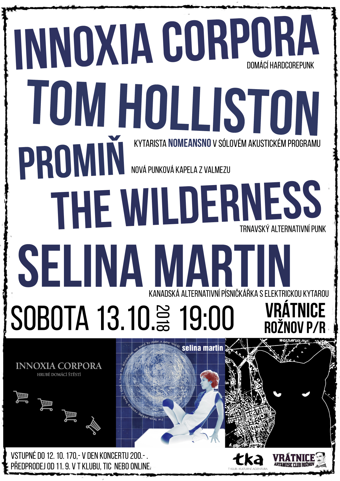 13 bude asi číslo s významem. Poté, co minneapolští Buildings odvolali turné, jsme datum koncertu zachovali a k Innoxia Corpora, kteří se měli zhostit role předskokana, jsme pozvali trnavské The Wilderness hrající originální punk zpívaný v rodném nářečí. Jejich posledních zápichem bylo vystoupení na festivalu Pohoda společně s Pussy Riot. A chystají novou desku. No a pak přišla nabídka, která se prostě neodmítá. Tom Holliston, kytarista kanadských NoMeansNo začal svou sólovou dráhu v roce 2002 a po definitivním rozpadu kapely bratří Wrightů pokračuje ve své misi. Hraje originální dynamické písničky, trochu folk, trochu rock, ve kterých se doprovází na akustickou kytaru,. Na své evropské turné vyráží společně s další Kanaďankou, usídlenou dočasně v Cannes, Selinou Martin, která dokáže uhranout diváky na první poslech. Příjemný zpěv podpořený dravou elektrickou kytarou evokuje u recenzentů přirovnání k PJ Harvey, Björk, a ano, Davidu Byrneovi! Domácí scénu, jak už bylo zmíněno, budou reprezentovat Innoxia Corpora, kteří mají na kontě čestvý desetipalec "Hrubé domácí štěstí" a jejich kolegové ze zkušebny vedle, úplně nová kapela z Valmezu Promiň, která podle zaručených fám hraje skoro stejně dobře jako staré americké hardcorepunk kapely. Vzhledem k počtu kapel začínáme už v 19:00.
