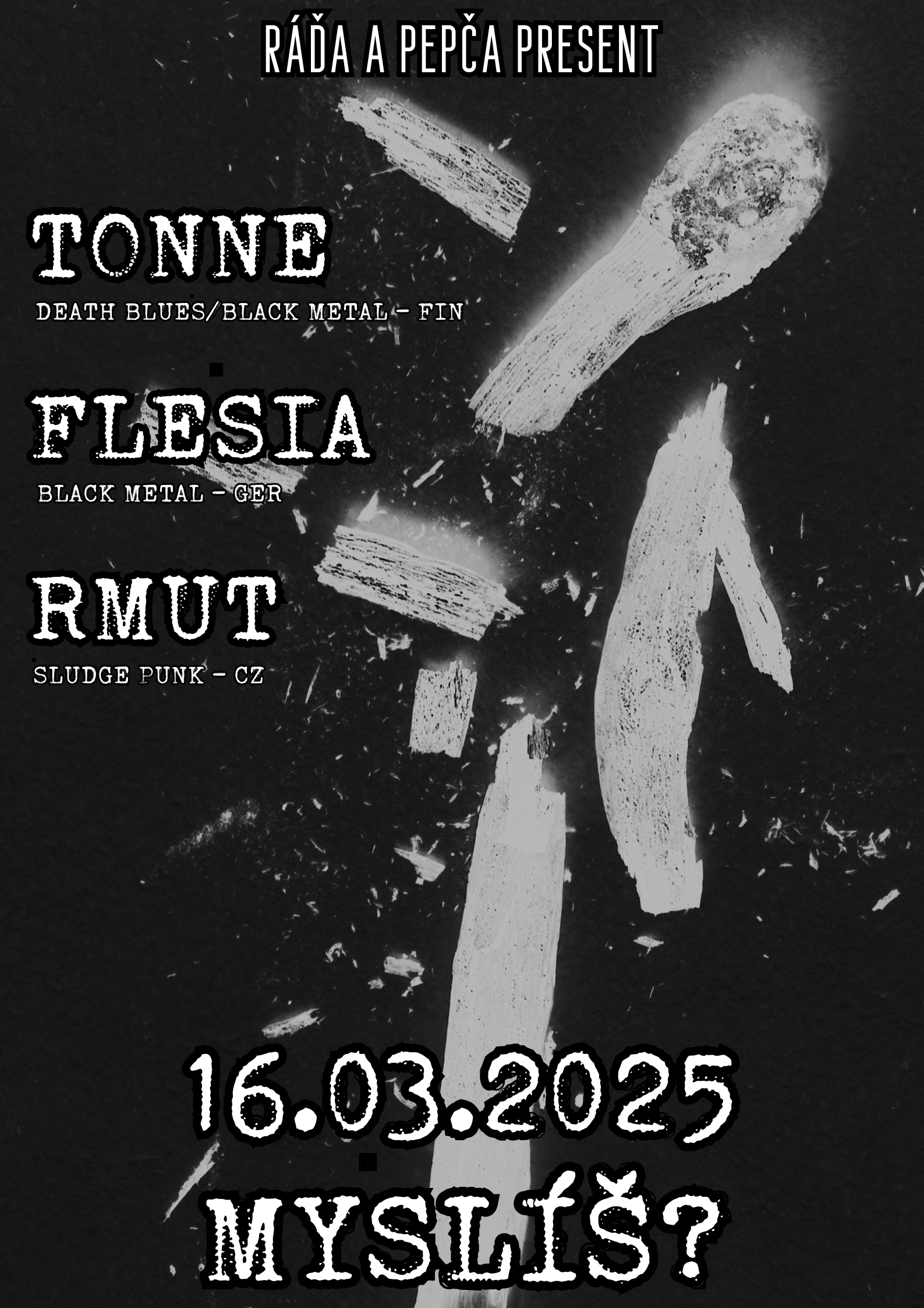 Rmut (CZ) - sludge punk válec, který jak vlna tsunami hrne před sebou vše živé. Hnusný texty a pomalá hudba plná beznaděje. Po delší pauze se Rmut vrací do koncertního dění, tak se přijď mrknout, jak už nehrajou stoner sludge, ale sludge punk.