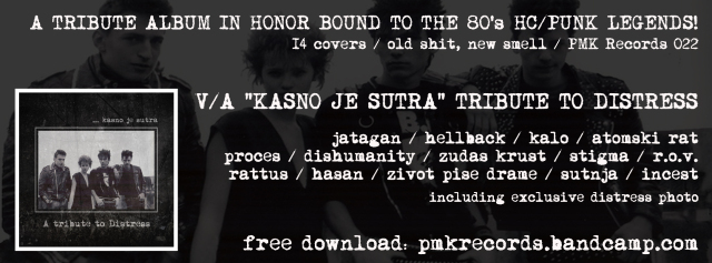 Srbské vydavatelství PMK records hlasí nový počin, kterým je kompilační tribute album "KASNO JE SUTRA" věnované ex-jugo hc/punk kapele Distress. Najdeme zde 14 coverů, o které se postaraly kapely jako RATTUS, PROCES, ZUDAS KRUST, ATOMSKI RAT ... volně ke stažení a poslechu zde.