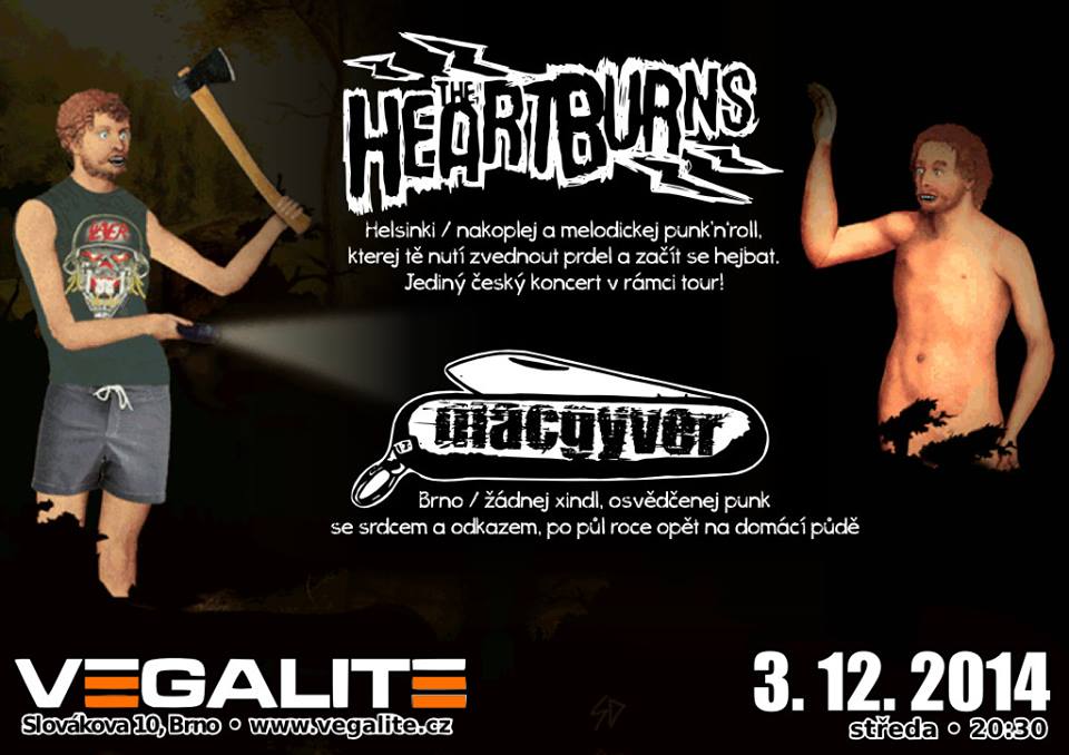 The Heartburns Finský kapely byly v Brně vždycky hodně populární a label Combat Rock Industry má pro některý lidi až kultovní status. The Heartburns ( stejně jako Wasted, Manifesto Jukebox, Sarkynet, Endstand a spousty dalších ) fachaj ve stejný fabrice bez píchaček a v rámci menšího turné odehrajou jedinej koncert v té naší zapařeně-přisprostlé kotlině. Kapela , ve který najdeš členy kapel Kaka hatta 77, Sarkynet atd., hrne parádní nakoplej a melodickej punk’n‘roll a už při poslechu jejich desek se dá předpokládat, že naživo by to mohl bejt absolutní masakr a akce, na kterou budeš vzpomínat i na smrtelný posteli. The Heartburns totiž hrajou přesně ten druh punku, kterej Tě nutí zvednout prdel a začít se hejbat. Takže pokud dorazíš, tak si nezapomeň naleštit taneční střevíce, vzít náhradní triko a případně přibalit i gaťky / slipky. https://www.youtube.com/watch?v=EJUoNMCN7mw https://www.youtube.com/watch?v=JQ-KZNhNLR4 MacGyver Myslím, že není třeba představovat a obšírněji se rozepisovat. Poslední ověřenej drb říká, že jejich melodickej hc/punk je velice populární i v redakci MRR. Dle mnohých vydali jednu z nejlepších česko-slovenských punkových desek a jejich koncerty jsou vždycky parádní zážitek. Tohle je totiž opravdová lyrika á la Kryl a ne nějakej xindl. http://www.macgyverpunk.com/ http://macgyver.bandcamp.com/