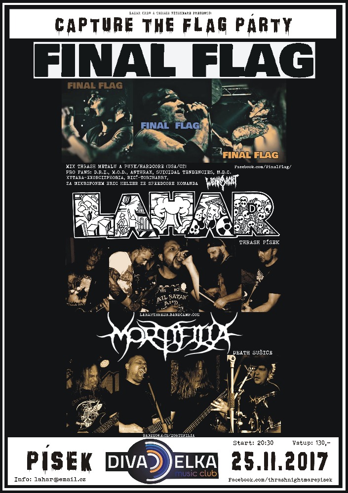 Poprvé děláme akci v Music clubu Divadélka a poprvé u nás zahraje nová kapela FINAL FLAG, v jejímž čele stojí frontman legendárních amerických Wehrmacht - Eric Helzer! Jeho doplňují Skoří (Exorcizphobia) a Jirka Rosa (Tortharry). Připravte se na pořádnou porci starého hardcore/thrashe! FINAL FLAG doprovodí na jejich písecké zastávce domácí LAHAR a sušická deathmetalová stálice MORTIFILIA!