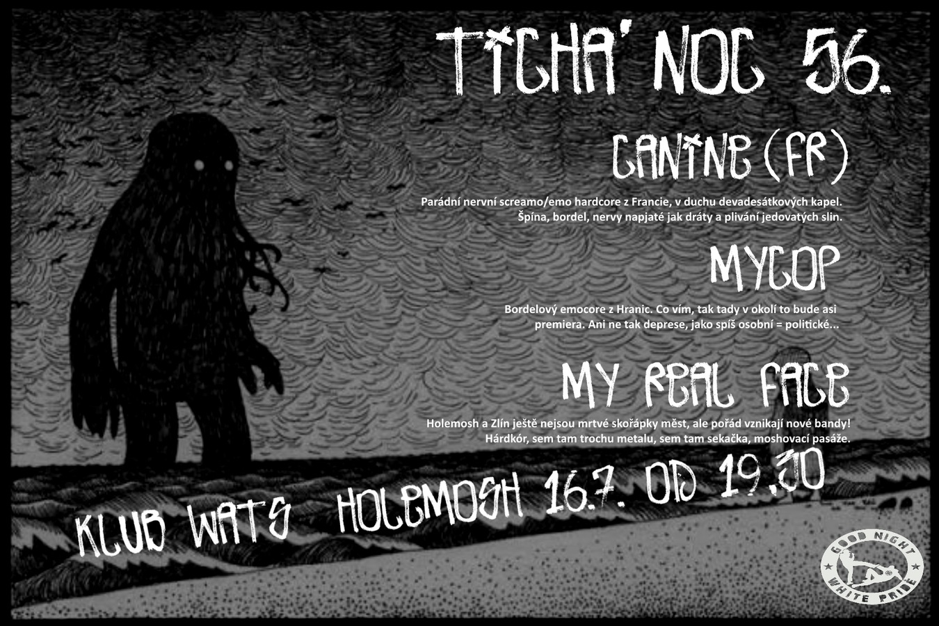 Prázdniny jsou na koncerty debilní termín, ale někdy nejde jinak. Když jsem kdysi s koncerty začínal, úplně první kapela co jsem pořádal bylo jedno staré screamo z Francie. A od té doby mi pro tyhle smečky zůstala veliká slabost. Takže Canine byla jasná volba. Neseď na prdeli a dojdi taky podpořit - co? Cooo? Canine (FR) - emotivní bordel, který umí právě francouzské kapely. Prima texty, změny tempa... Dost líbezná muzika! Mycop - poslední dobou celkem našlápnutá emocore kapela z Hranic. Muzikou i přístupem mi připomíná spoustu starších českých kapel (nechci zmiňovat ty jména začínající na L nebo R). Opět super texty, venku Lp singl s DIY obalem - se cení jako! My Real Face - místní mlaďoši, co už daleko míň hrnou tuctový metalcore a mnohem víc tlačí na klasickou hardcore pilu. Sem tam moshovací pasáž, sem tam sekačka. Čím dál tím lepší to je! No a když jdou ti starší do práce, začneme fakt na čas -. na těch osm. Když jsou ty tři kapely...