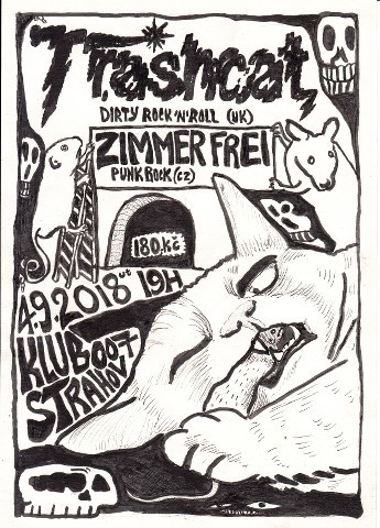 Darragh, dříve bubeník nekompromisních anglických punkerů The Restarts, se po sedmi letech vrací na strahovskou Sedmičku se svou dirty rock and rollovou bestií Trashcat. Geniální věci bývají jednoduché a Trashcat svou genialitu našli v kombinaci kick ass rockových riffů s melodickým punkem a syrovým rock´n´rollem. Má to švih, má to říz, má to punkovou drzost i pohodu bezstarostný jízdy. Refrény se vám za chvíli vpijí pod kůži a už se nepustí. Jako speciální host vystoupí stará známá (nejen) pražská galerka, přísnej speed punk rock, co vás rozmázne jako parní válec - Zimmer Frei!