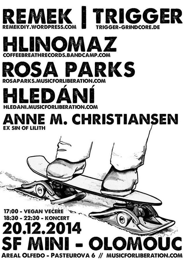 TRIGGER (Německo) - divoký powerviolence hardcore v punkovém duchu, GlauchauHLINOMAZ - noisepunk destrukce, Praha REMEK - krátký a hlasitý emo hardcore, Praha ROSA PARKS - melodický anarchopunk, ex - Tupak Amaru, Orlová ANNE M. CHRISTIANSEN - emo novinka, ex - Sin of Lilith, Orlová HLEDÁNÍ - riotfolk Dana z Rosa Parks, Orlová