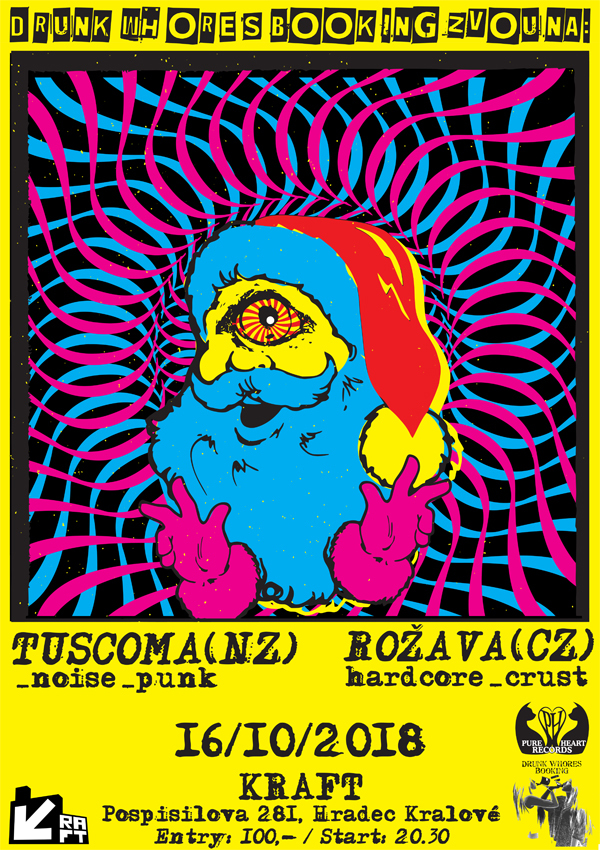 - Tour šílenci (původním názvem Hollywoodfun Dowstairs) z Nového Zélandu, kteří čerstvě změnili název na Tuscoma nemají hraní evidentně stále pořád dost, takže se opět vrátí v říjnu do Hradce Králové v rámci svého dalšího ne zrovna malého turné. Tahle kapela začínala původně ve třech, ale později kluci začli mastit svou svižnou porci nervního a energického noise-punku s lehkými vlivy novějších new-wave kapel, posléze už jen jako duo kapela.