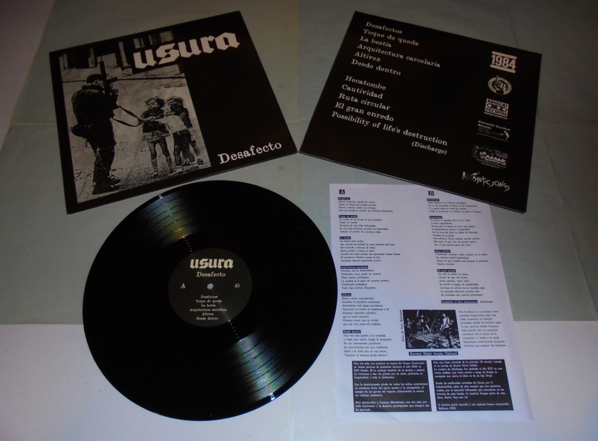 Nová v pořadí třetí, velká deska USURA d-beat raw punk rubanice z Palma De Mallorca. Když jsem je viděl na živo v roce 2015 na Defenestre Festivalu v Zarautz Gaztetxea squatu, byl jsem ohromen sílou, kterou kapela doslova explodovala. Největším zážitkem a vlastně hlavním aspektem kapely je kytara Mistra Bernata, jako by startovali stíhačky, tak to na mne působilo, všechny dojmy a pocity z festivalu se zachovali do dnes, skoro jako včera. Vždy když si pustím jejich nahrávky mám tento pocit, ostře, naprosto výborně nabroušený zvuk kytary s dunivým zvukem všech zbylých nástrojů, včetně řvaného zpěvu ve více polohách ve Španělštině, žádná angličtina, kapela svoji tvář neztratila, jen tak dál, jejich muzika, lyrika ti dodá to pravé co je třeba a ne jen to, výčet kapel, v kterých členové hrají/hráli je rovněž ohromující. Celá nahrávka se nese v duchu, blíže o pár let zpět k ranné, syrové tvorbě kapely jako je singl a debutní LP Legado, zní to zatraceně dobře, závěrem na straně B je cover skladba od Discharge, deska je věnována Martimu - RIP. Jsem velmi poctěn, že můžeme tuhle desku dělat společně. Příští rok (2024) kapelu uvidíme na MNFL festivalu, kam konečně zavítají. Vyšlo 500 kusů na klasicky černém vinylu, poslech jedné skladby u labelu. Převelice hezký závěr tohoto roku. Více info o kapele, vydání na odkazech.