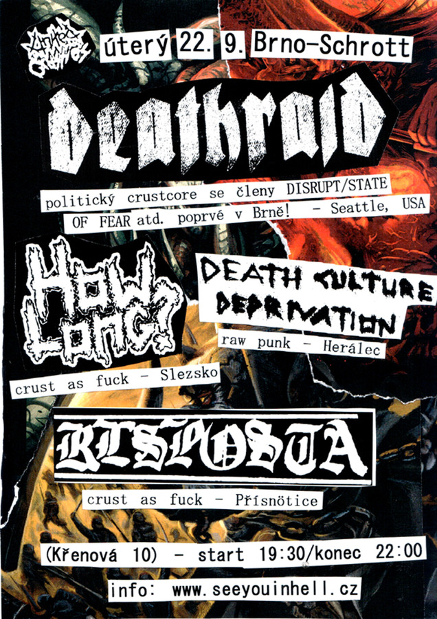 DEATHRAID (Seattle, USA) – čistá crustcore rubanice od téhle léty prověřené kapely ze západního pobřeží USA, která v rámci svého druhého evropského turné poprvé (a konečně!) zavítá do Brna. Zpěvák DEATHRAID Jay má za sebou solidních 25 let aktivního hraní v kapelách, které v podstatě definovaly politický crust 90. let, ať už se jednalo o DISRUPT, STATE OF FEAR nebo o CONSUME. V DEATHRAID ho pak doplňují další veteráni amerického crustu, co hrávali vedle CONSUME např. v DECREPIT, SHITLIST, WHOREHOUSE OF REPRESENTATIVES nebo v INHASTE. Kapela má venku dvě samostatná LP na labelu Keitha z HELLSHOCK Black Water Records a split LP se Švédy DESPERAT. Připravte se na intenzivní, špinavou non-stop crustcore palbu s těžkotonážním zvukem, zabijáckými riffy a v maximálně energickém podání!