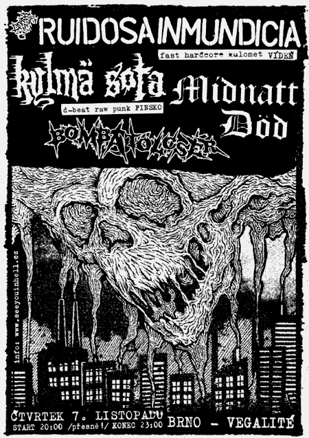 RUIDOSA INMUNDICIA (Rakousko) - hyperaktivní vídeňská úderka po roce a půl zpátky v Brně, super-energický hardcore s kulometným volálem ve španělštině a hodně polit. texty, teď v září na svém prvním turné po USA a zároveň se split singlem s DROPDEAD venku, listopadový středoevropský mini-výlet s K.S. má jen čtyři data a to brněnské je jediným u nás https://www.youtube.com/watch?v=SGzQ0ABWgTA