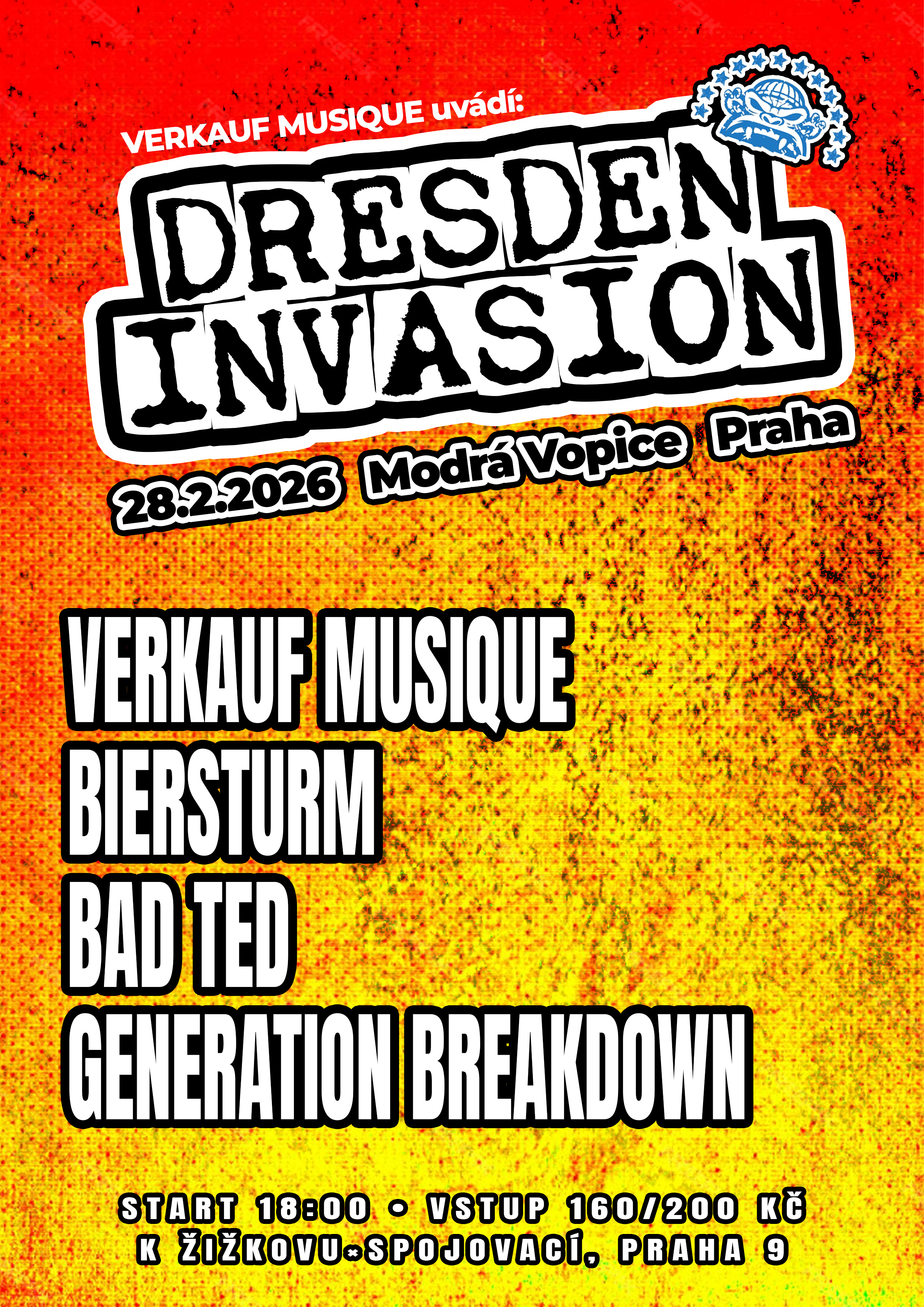 V sobotu 28. února 2026 se v pražském klubu Modrá Vopice uskuteční koncert Verkauf Musique: Dresden Invasion, který propojí pražskou a drážďanskou punkovou scénu. Na jednom pódiu se představí domácí kapela Verkauf Musique společně s drážďanskými kapelami Generation Breakdown, Biersturm a Bad Ted.