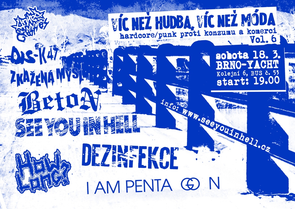 Již šesté pokračování tohoto festivalu se hlásí o slovo!Tradičně s vegan večeří, freeboxem, Food Not Bombs, atd. Večeře bude opět zcela neorganizovaná a bude začínat v podstatě až s časem koncertu a bude jen na vás všech, jaký tomu dáte průběh, aneb…“ co si navaříte, to si taky sníte“ !!! 19:00 START !!! DIS K47 - tento punk / d-takt ze Znöjmä rozkopne dveře Yachtu jako první. http://bandzone.cz/disk47 ZKAŽENÁ MYSL - crust punk z Valašska, složený ze zkušených harcovníků místní líhně, s novou posilou za mikrákem. http://bandzone.cz/zkazenamysl BETON - metalem načichlý punk a nebo punkem načichlý metal? Račte si vybrat. Tato nakládačka z Bratislavy, po rošádách v sestavě opět v Brně na Yachtu. https://betoncrust.bandcamp.com/ SEE YOU IN HELL - domácí hell team v krátké době opět na prknech Yachtu, avšak na druhou stranu nás dlouho nikde v Brně a okolí neuvidíte. http://www.seeyouinhell.cz/ HOW LONG - oldies crust as fuck, avšak pouze věkem aktérů! Neúnavní severomoravští crustoví bardi nás opět po delším čase poctí svojí návštěvou. http://bandzone.cz/howlong DEZINFEKCE - jihočeské hc / punkové tornádo, které nedávno oslavilo 25. let běsnění … „nezapomeň, hlídej si záda, nezapomeň, někdo to ví“! http://bandzone.cz/dezinfekce I AM PENTAGON – relativně nová kapela z Prahy, kde třímá mikrofon ostřílený frontman Banán. Aneb další Banánova variace na téma punk. http://bandzone.cz/iampentagon Klub Yacht: Kolejní 6, bus č. 53, tram č. 12 Koncert bude jako vždy nekuřácký! Pro příště už to bude snad automatické a nebudeme to muset psát. Jen škoda, že toto musel vyřešit až zákon …