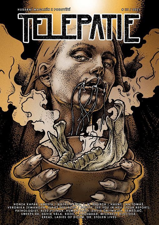 Telepatie – hudebního magazínu z podsvětí. Po roce jsme zpět s třetím pokračováním, které svým konceptem plynule navazuje na předchozí dvě vydání. Na 152 stránkách najdete převážně rozhovory, které jsou z valné části zaměřené na jednotlivé osobnosti. První z nich je s Honzou Kapákem (Hellsound studio, BOHEMYST, MASTER´S HAMMER...), následuje povídání s Janem Tomášem (TOMÁŠ PALUCHA, LVMEN...), Veronikou Zemanovou (KALLE...), Trevorem z HAUNT, Kozlem z KAOSQUAD, Lukášem Sedláčkem z DRUTTY, Davidem Válou (VOLE, TÁBOR…), Alešem Vilingrem (ET MORIEMUR, SOMNIATE…) a Václavem Dobiášem aka SWEEPS 04. Zrod své třetí desky komentují OR. HC/punkoví HUMAN FAULT představí svou kapelu. V rozhovoru s PATHOLOGIST se detailně probere éra téhle legendární skupiny. Do světa audiokazet dá nahlédnout osoba nejpovolanější, David Šmitmajer. Nejen fanzinovou a webzinovou scénu představí Michaela Klocová z Kids and Heroes. O pořádní koncertů barvitě povypráví kolektiv kluků z Kreas. V zinu nechybí ani tour report o putování po jihovýchodní Asii, který napsal Beňo ze SEE YOU IN HELL. ZEMĚŽLUČ letos slaví 35 let, a tak se ohlédneme za historií téhle kapely, od vzniku po současnost se projdeme se STOLEN LIVES. V jedné z anket se zabýváme zvláštními názvy kapel, zatímco v té druhé se podíváme do světa žen, které zpívají v doommetalových kapelách. Kontakt pro info a objednání: