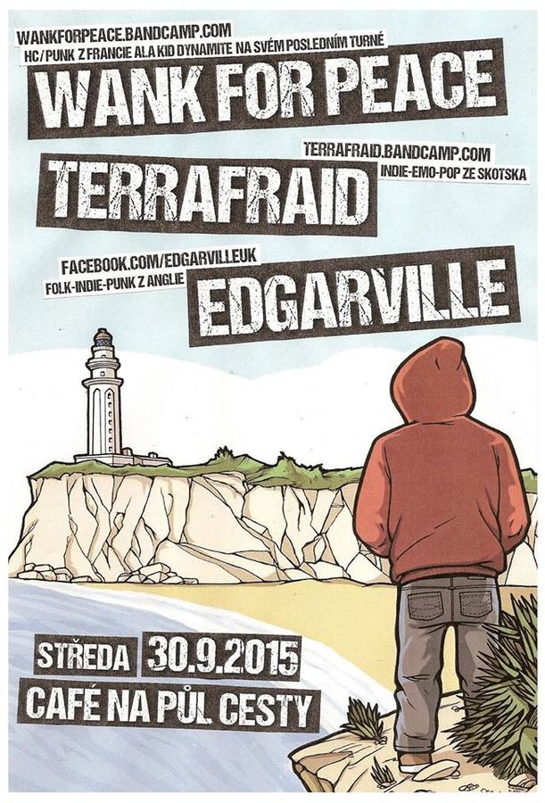 Tenhle koncert měl být původně o dvou kapelách z Anglie a Skotska, TERRAFRAID a EDGARVILLE. obě ve stylu devadesátkového indie/alternative ema a folk-pop punku. Ale na poslední chvíli se ozvali WANK FOR PEACE z Francie s tím že shání last minute koncert v Praze v rámci jejich posledního euro tour. A nebylo nic jednoduššího a logičtějšího než to celý spojit dohromady. WFP dost možná už znáte, melodický a naživo neuvěřitelně energický hc/punk hodně ovlivněný kapelama jako Kid Dynamite nebo Lifetime.