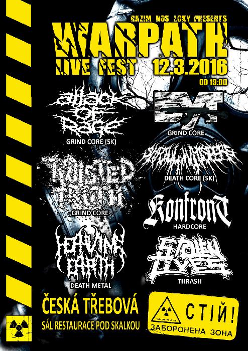 19.WARPATH LIVE FEST: ATTACK OF RAGE SK(grind), HEAVING EARTH (death metal), KONFRONT (hardcore), BUT (grind), SHRILL WHISPERS SK(deathcore), STOLEN LIVES (thrash), TWISTED TRUTH (grind).