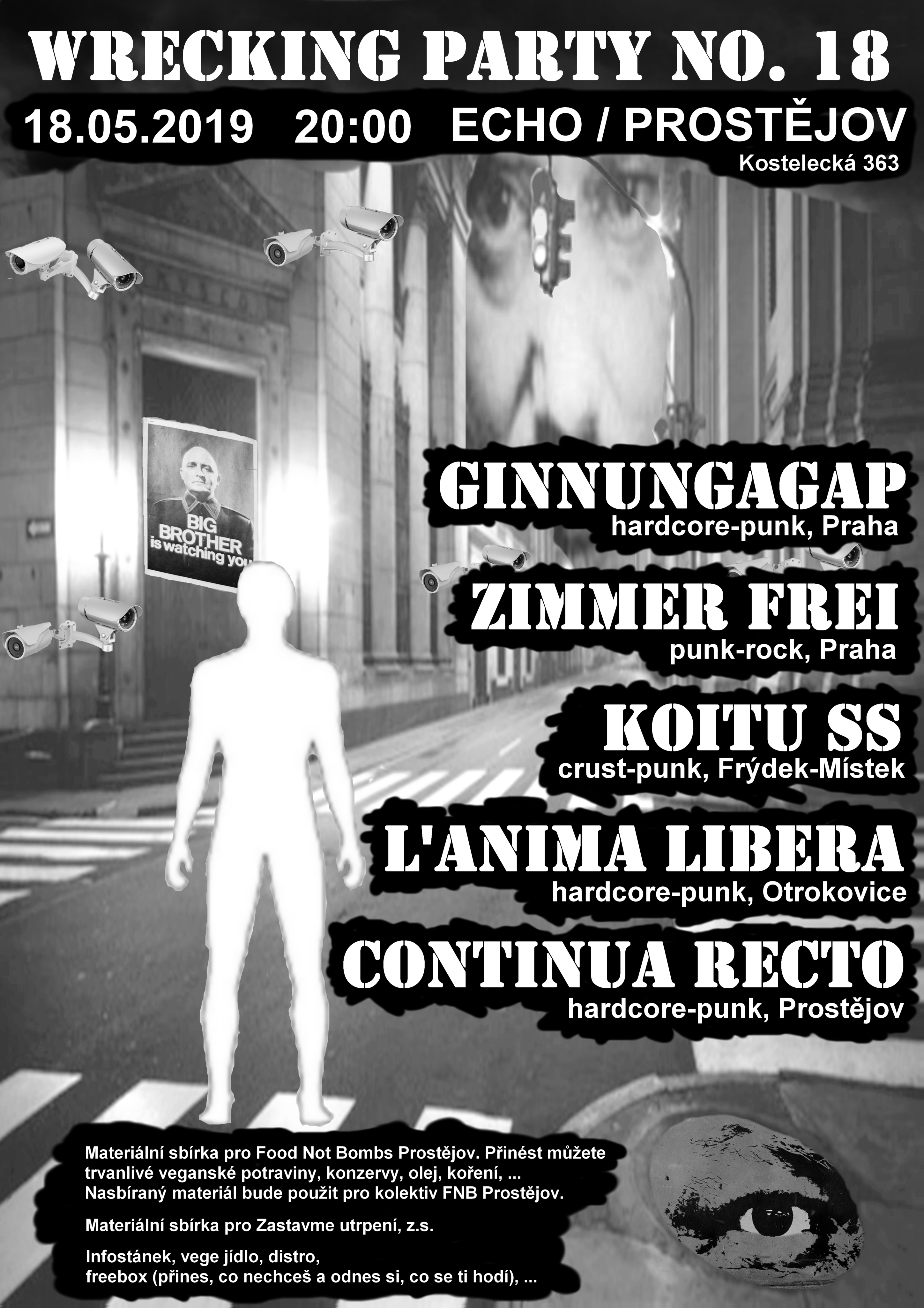 Materiální sbírka pro Food Not Bombs Prostějov Přinést můžete trvanlivé veganské potraviny(sojové kostky,luštěniny,rýži...),konzervy,olej,koření,atd....Nasbíraný materiál bude použit pro kolektiv FNB Prostějov http://food-not-bombs.cz/prostejov Materiální sbírka pro Zastavme utrpení,z.s. http://oszastavmeutrpeni.g6.cz/ https://www.facebook.com/Zastavme-Utrpen%C3%AD-zs-136160353136605/ Infostánek(materiály z oblasti ekologie,lidských i zvířecích práv),vege jídlo,distro(LP,CD,MC,ziny...),bezpeněžní zóna-freebox(přines,co nechceš a odnes si,co se ti hodí)... Možnost přečkání v klubu do odjezdu prvních spojů