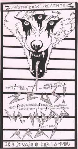 Místní Borci uvádějí V neděli se do Plzeňského divadla Pod lampou přijede podívat sám mocný Zeus toho času v Itálii! Normálně se ohání hromy, blesky a ničí vše živé. V tento den se však rozhodl, že bude u zrodu. U křestu nového EP tajemňáka Mr.NOBODYho a požehná mu tak vše dobré. Stejně jako Arai ze Stodu, na které se také moc těšíme! ZEUS! [Itálie, Three One G Records] no noise rock / no math core / no prog http://zeuspower.bandcamp.com/ https://www.facebook.com/zeusband?fref=ts ZEUS! Made in Italy! Je basa - bicí duo zrozeno jednoho října v roce 2010. Kope to zle. Po domácku upravený bicí a basa spolu s nakřáplým vokálem se ti zaryje pod kůži. Kope to hodně. Jako kdyby chtěli ohlodat skálu na kost a zbíječka s dynamitem sou chudý příbuzný. Na hlukový stěny, co vytvářej, by se měl normálně chtít zbrojní pas. A to se k tomu ještě kluci snaží z minima vytěžit maximum hehe. Hlavně si nemyslete, že to co hrajou je metal, punk, matyka, noise, prog a rozhodně né jazzcore či post-cokoliv! Snaží se pouze osvobodit skrz hudbu ze zaběhlých škatulek našeho konvenčního a předvídatelnýho světa. A přitom se jim asi omylem povedlo natočit dvě desky. První „Zeus!“ a druhou z roku 2013 s názvem „Opera“, na které se v jednom songu objevil i Justin Pearson známý např. z The Locust, Retox a mnoha dalších. Ten s nimi bohužel nepřijede, ale to už bychom chtěli vskutku moc žejo. Už stačí, že svoje desky vydávají u Three One G Records! Kluci jsou kromě hraní na boha součástí i dalších špagety kapel Calibro 35, Craxi, Fuzz Orchestra nebo Ronin, což už také o něčem svědčí, že? https://www.youtube.com/watch?v=G4870lObRW8 https://www.youtube.com/watch?v=VTle-xG-074 https://www.youtube.com/watch?v=tFtBB_BW8hk Mr.NOBODY [Plzeň, Dog Bless You Records] prodog / monotonoise / experiMENTAL http://mrnbdy.bandcamp.com/ http://dogloversrecords.net/dogblessyou/ Tajuplný, relativně čerstvý projekt jednoho nejmenovaného, už dokázal udělat dost slušnej povyk. Jen je škoda, že víceméně mimo naši českou díru. Možná to bude tím, že za sebe všude nastrkuje PSA! Jo a je tak drzej, že dokonce vytváří psingly, kde mu hostují jeho čtyřnozí kamarádi! To si pak všecko nahrává a bezostyšně prodává do světa… Jak neslýchané! Občas zajde až tak daleko, že pod nálepkou svého vydavatelství Dog Bless You Records zasílá natěšeným zákazníkům desky, ze kterých se vysypou konfety, desky, na kterých jsou jen texty a žádná hudba, download kódy zabalené do prázdných kazet. Desky s otisky psích tlap a samozřejmě desky natočené samotnými psi (ano, z toho smrdí určitě genetické inženýrství a možná i křížení psa s vydavatelem). A jelikož v lampě prej nejsou žádný kočky, tak se Mr.NOBODY rozhodl právě v tento den pokřtít své nové 10” splitko s Witches of Malibu a chystá speciál live set, kde mu bude oporou jeho analogová TROGOTRONIC láska. Haf! http://www.rozhlas.cz/radiowave/spina/_zprava/dog-bless-you-records-ve-s... Arai [Stod] post rock https://www.youtube.com/channel/UCVpL8W63Q-ZU5k2K93_zAwQ/videos Arai jsou tři kluci ze Stodu. Nebo ze Stoda, teď nevim. Tedy skoro místní a svým talentem dokazujou, že s nima prostě musíme počítat... Nedávno vylezli ze zkušebny a mají za sebou teprve pár koncertů a z důvěryhodných zdrojů se na kluky valí samá chvála! Píšou, že hrajou post rock, aby si pak klidně zahrávali třeba s noise rockem nebo třeba post metalem. Nezpívaj, ale umí to. Nepotřebujou ukázat víc, je tam vše! https://www.youtube.com/watch?v=aEBD_55HnQU&list=UUVpL8W63Q-ZU5k2K93_zAwQ https://www.youtube.com/watch?v=ADGQMmDXh7s&list=UUVpL8W63Q-ZU5k2K93_zAw...