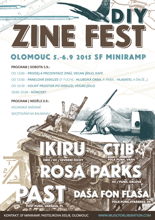 Rozhodli jsme se uspořádat zinfest, setkání všech milovníků tištěných fanzinů i těch, kteří jsou jen zvědaví, v čem že tkví to kouzlo mnohdy na koleně dělaného zinu. Rádi bychom shromáždili tuzemskou tvorbu hc/punkových zinů od historie až po současnost a pozvali autory a autorky, aby přijeli své ziny představit. Na programu bude též panelová diskuze s autory, kteří se již dlouhá léta baví vydáváním fanzinů a workshop směřovaný k praktickému vytváření zinů. Součástí sobotního programu bude taky koncert – Ctib, Daša fon Flaša, Ikiru, Rosa Parks a PAST (Varšava, Polsko). Další den bude pro přespolní připravená veganská snídaně a pro zájemce taky skejtovačka na baumaxu.
